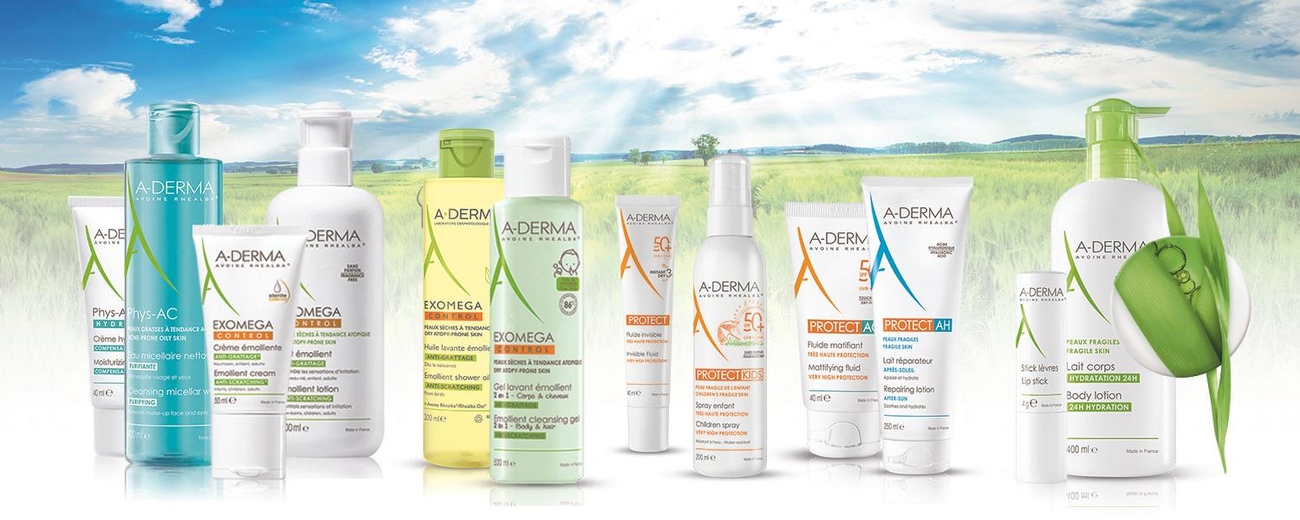 Značka A-Derma nabízí emolienční krémy a tělová mléka, sprchové oleje a gely, pěnivé gely, mléka a spreje na opalování, čisticí micelární vody, krémy na obličej i tělo a jiné.