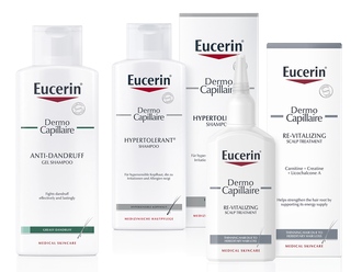 - Eucerine DermoCapillaire – Pečuje o citlivou vlasovou pokožku. (šampon proti lupům, tonikum proti vypadávání vlasů)