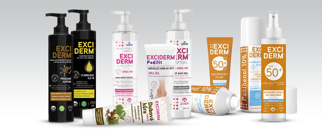 Značka EXCIDERM® nabízí řadu prémiových dermokosmetických přípravků pro každodenní péči o suchou a atopickou pokožku s obsahem urey, šampony pro podporu růstu vlasů a při problémech s lupy a opalovací přípravky, které chrání pokožku před škodlivým slunečním zářením.