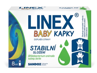 Linex® BABY kapky je doplněk stravy, obsahuje bakterie mléčného kvašení Bifidobacterium animalis subsp.lactis. Doplňky stravy nejsou určené pro náhradu pestré stravy.