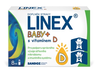 Linex® Baby+ s vitamínem D je doplněk stravy, obsahuje bakterie mléčného kvašení Bifidobacterium animalis subsp. Lactis BB-12®. Doplňky stravy nejsou určené pro náhradu pestré stravy. BB-12® je registrovaná známka společnosti Chr. Hansen A/S.