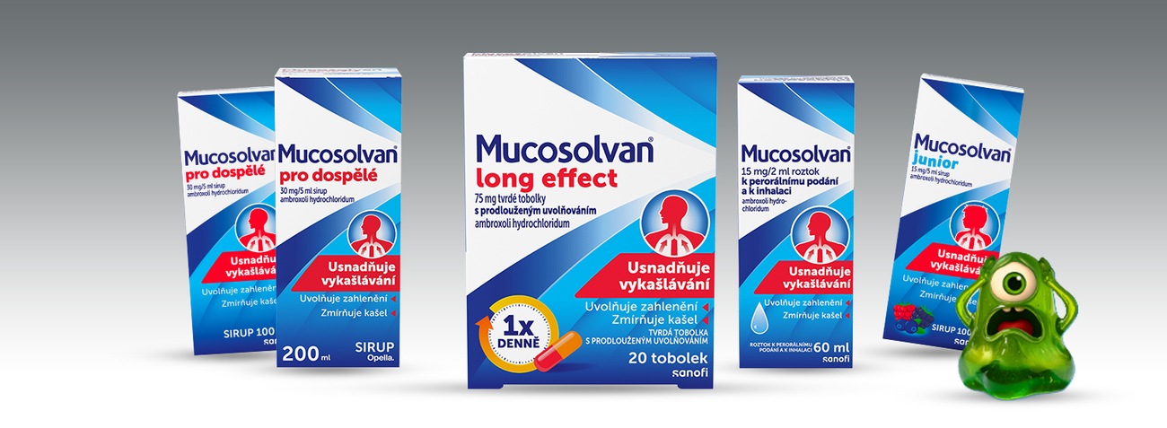Léčivý přípravek s obsahem ambroxolu pro snadnější vykašlávání, pro dospělé i děti.