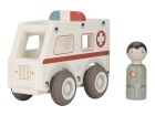 Dřevěná sanitka s realistickými detaily a gumovými kolečky je připravena rychle dopravit pacienta do nemocnice.