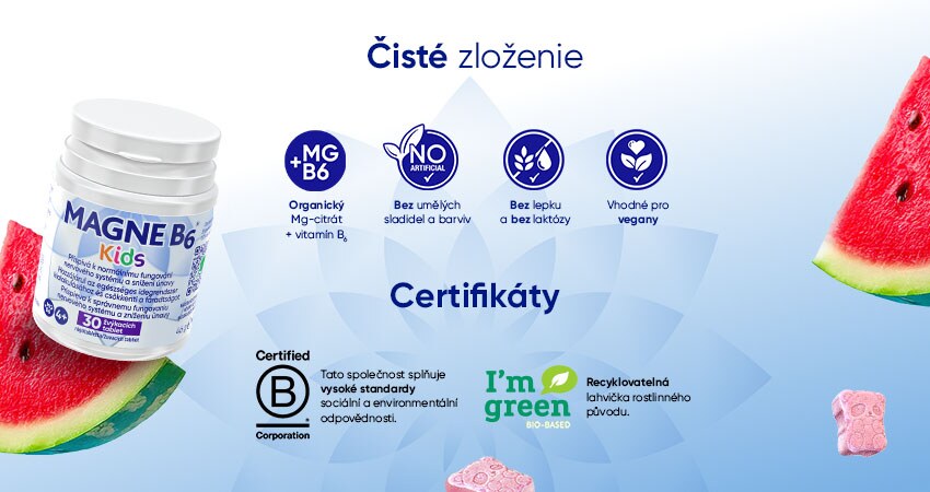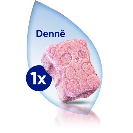 Žvýkací tablety s obsahem hořčíku ve tvaru pandy s přírodní příchutí vodního melounu vyrobené speciálně pro děti.