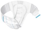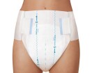 Kalhotky rozbalte, podélně přehněte na půl (absorpční vrstvou dovnitř) a jemně promačkejte, chytněte boční elastické pásky a upevněte vpředu, narovnejte okraje, uhlaďte a ověřte správnost nasazení jediným pohledem. Kalhotky totiž mají na zadní části naznačený střed, který musí být v linii s páteří. Vyměňujte maximálně po 8 hodinách.