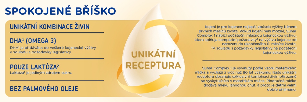 Kojení je pro kojence nejlepším způsobem výživy během prvních měsíců života. Pokud však kojení není možné, Sunar Complex 1 nabízí první náhradní kojenecké mléko, které je inspirováno složením mateřského mléka a splňuje veškeré požadavky na výživu kojence od narození do ukončeného 6. měsíce života.