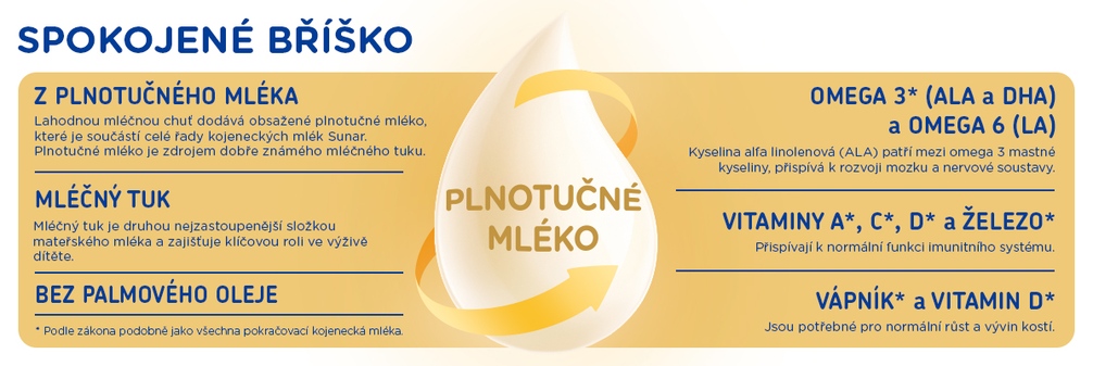 Plnotučné mléko, ze kterého je Sunar Complex vyroben, dodává mléku lahodnou chuť, a proto je dětmi velmi dobře přijímáno a mají spokojené bříško.