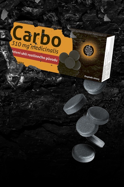 Doplněk stravy s obsahem aktivního uhlí.